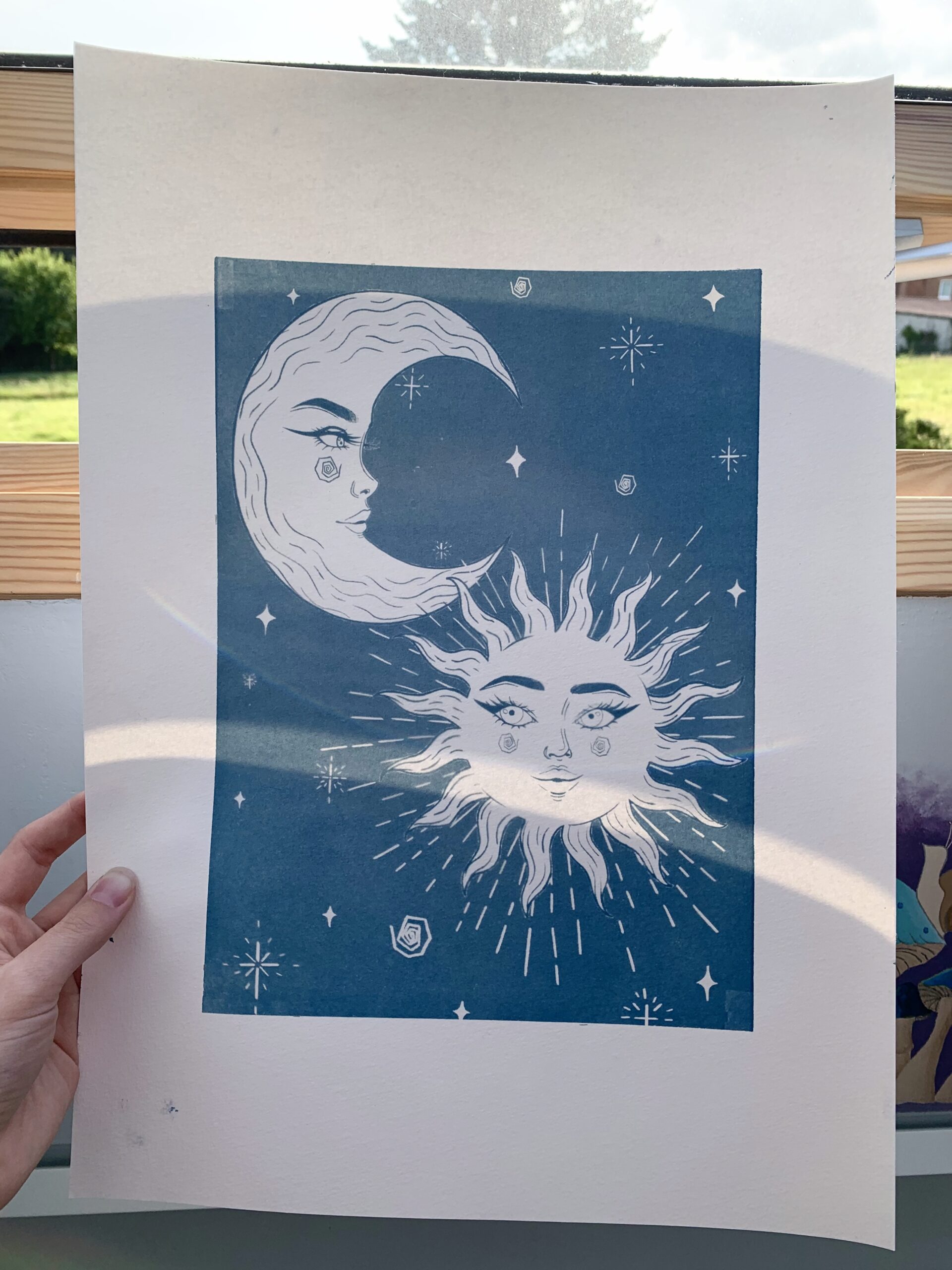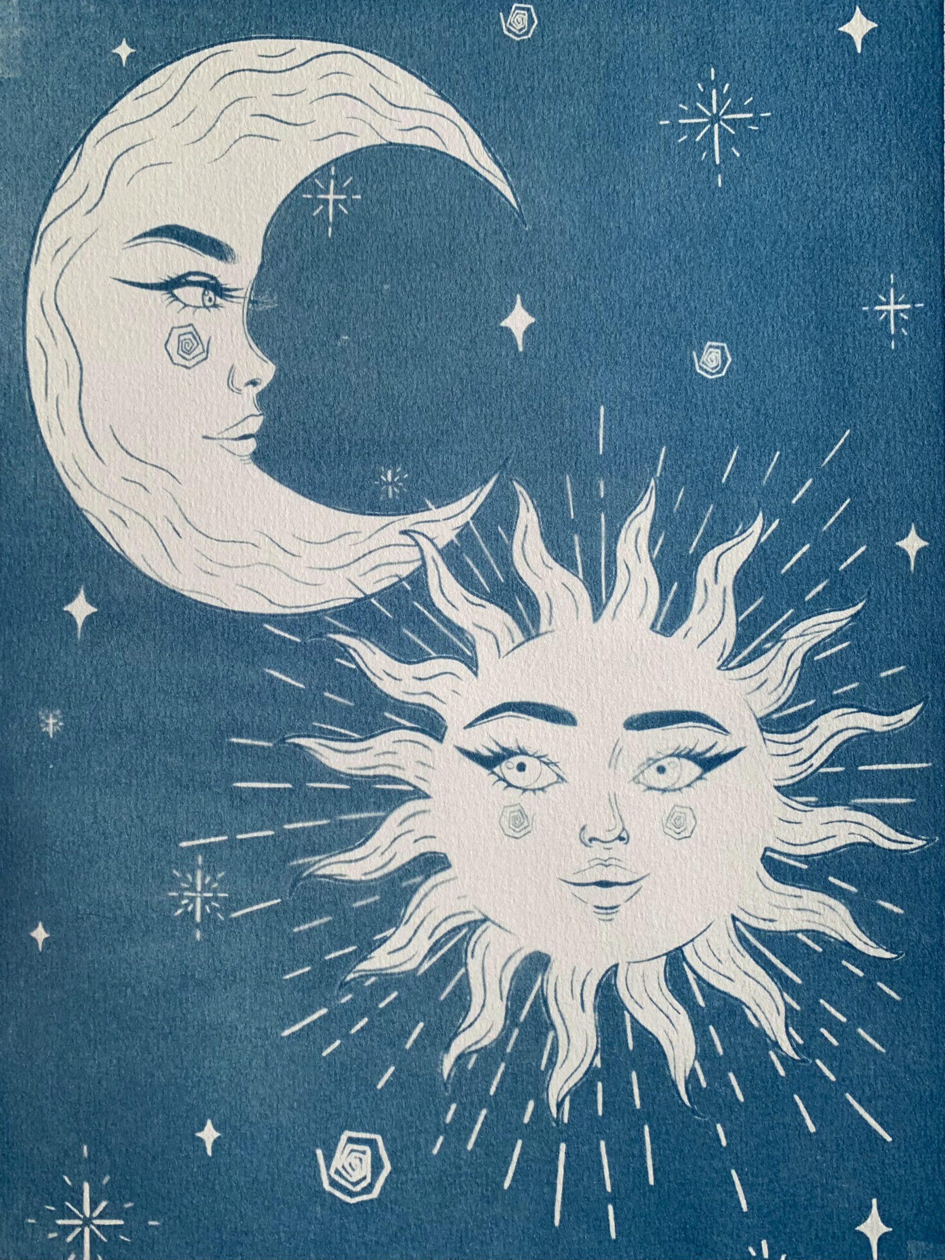 « Le soleil voit ce que je fais, mais la lune connait tous mes secrets. » Impression en cyanotype* sur papier. Vendu avec le cadre. Tirage réduit.